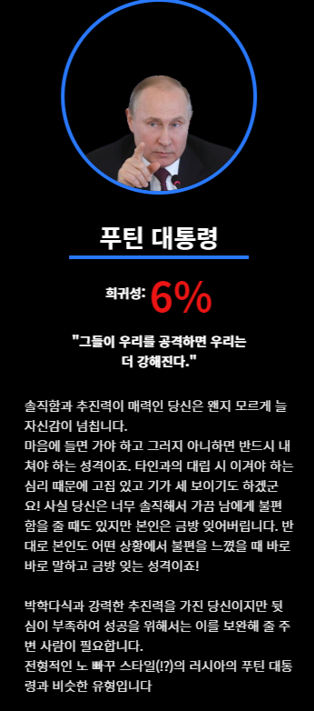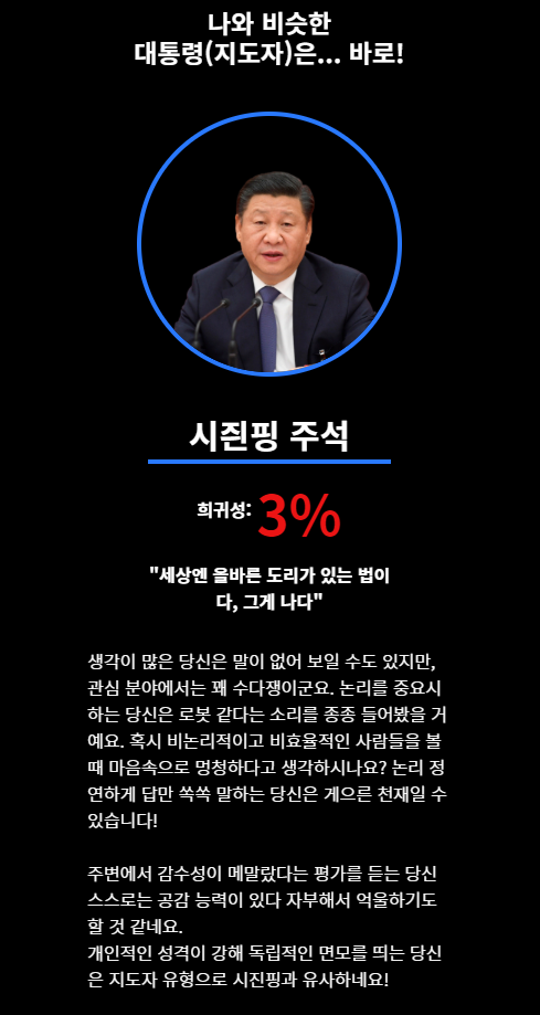 검사 결과에는 다양한 대통령이 등장하며, 자신과 성향이 유사한 대통령이 제시됩니다. 검사 결과로 나올 수 있는 대통령으로는 아베, 김정은, 박근혜, 노태우, 노무현, 시진핑, 이승만, 전두환, 트럼프, 푸틴, 오바마, 김대중 등이 있습니다. 결과를 통해 해당 대통령의 리더십 스타일과 성격을 간단하게 비교해볼 수 있습니다.