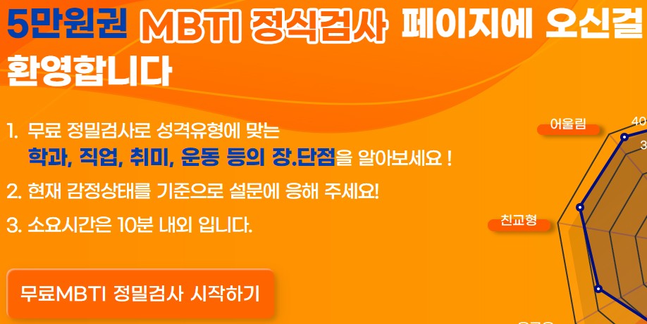 아래 링크를 통해 <한국 mbti 심리 연구소> MBTI 성격 유형 검사 무료 테스트를 받아 보실 수 있습니다.