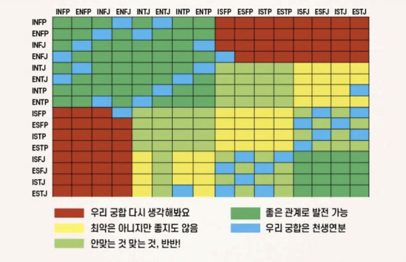 - 최악의 궁합: ISFJ, ESFJ, ISTJ, ESTJ, ESTP